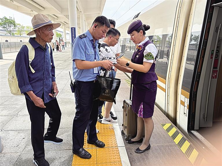 “站臺(tái)邊的旅客請(qǐng)往安全白線里走,帶小孩的旅客,看好自己的孩子!”這句話,每趟車(chē)劉鑫都要重復(fù)十多遍。暑運(yùn)以來(lái),列車(chē)密集到發(fā),短短3個(gè)半小時(shí)就到發(fā)列車(chē)17趟??瓦\(yùn)值班員劉鑫不停地在不同站臺(tái)間來(lái)回奔波,不僅要與列車(chē)長(zhǎng)辦理交接,而且要做好旅客乘降引導(dǎo)和安全防護(hù)。
