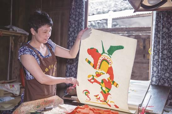 一日為師,終身為父。鐘海仙技藝好、人品好,對家人有擔當,對尹冬香也非常關(guān)心,傾囊相授。因為年畫在冬天印刷,下半年才有事做,上半年尹冬香就去其他作坊打工,一邊糊口,一邊學習掌握灘頭紙文化的其他技藝。尹冬香善學肯做,很受歡迎,下半年師父來領(lǐng)人時,對方總是不愿放人,為此還得罪了一些作坊。后來,尹冬香一去上工就講好,到了冬天必須要跟師父回去印年畫,大家也就不怪了。