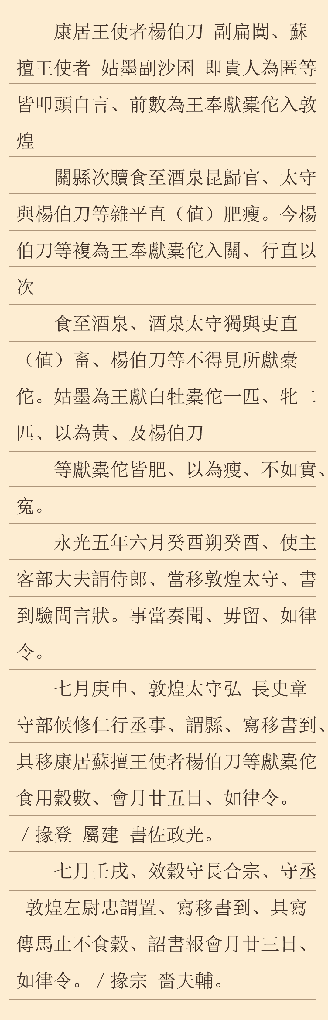 但是,這次獻(xiàn)貢物的情況卻與之前有所不同。當(dāng)康居王使團(tuán)從玉門關(guān)進(jìn)入敦煌境內(nèi),從敦煌到酒泉,沿途中沒有收到任何漢廷官員供應(yīng)的食物。到達(dá)酒泉后,酒泉太守和吏卒對(duì)其供奉的駱駝進(jìn)行評(píng)估時(shí),沒有通知康居王使者楊伯刀等其他朝貢人員到現(xiàn)場(chǎng)參加評(píng)估,僅漢廷官吏單方面對(duì)所獻(xiàn)的貢物進(jìn)行了評(píng)價(jià)。酒泉太守評(píng)價(jià)的結(jié)果與貢物的實(shí)際有較大的出入,使者楊伯刀帶來的駱駝本來是膘肥體壯的三匹白駱駝,可酒泉太守及其下屬卻定為羸瘦的黃駱駝。面對(duì)這不如實(shí)的評(píng)估結(jié)果,楊伯刀等人上告朝廷,申訴冤情。