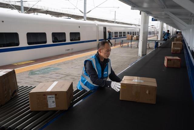 11月11日,在成都雙流西站,工人將電商快件從動(dòng)車上搬運(yùn)下來(lái)。新華社記者 江宏景 攝