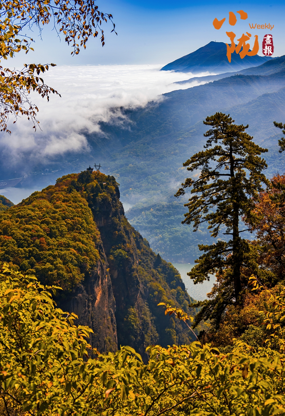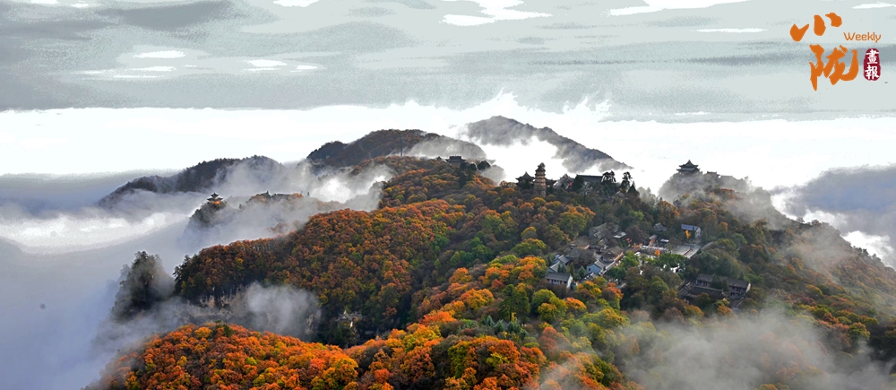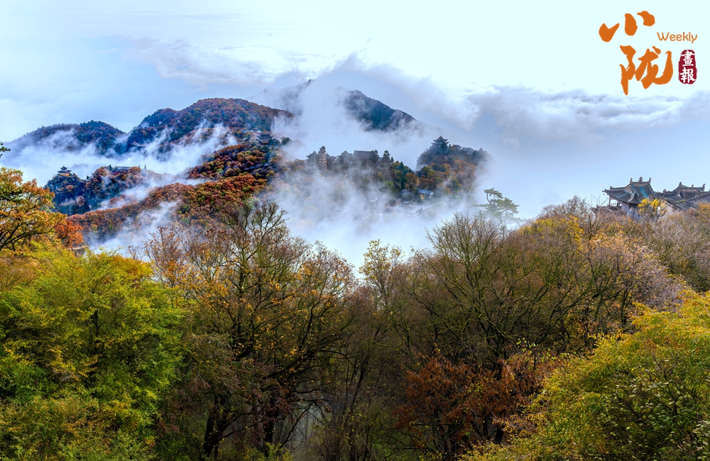 一葉知冬,遍地金黃。五彩斑斕的林木與古香古色的建筑、遠處的山巒云霧相映成趣,盡顯詩意之美。