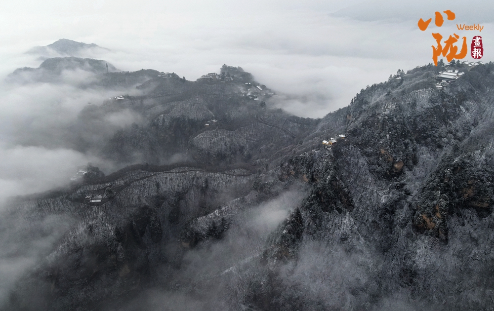 古建筑群在山雪映襯下,更顯古樸、神秘,常青樹木為冬日增添了生機。