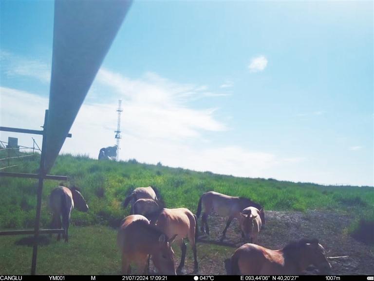 近日,甘肅敦煌西湖國家級自然保護區(qū)管護中心工作人員整理紅外相機拍攝畫面時,發(fā)現(xiàn)拍攝到普氏野馬“哺乳”的清晰影像。畫面拍攝于今年7月下旬,有8匹普氏野馬繁殖群正在馬圈灣濕地的飲水泉附近活動,其中有一匹小馬駒滿足地吸吮著母馬的乳汁。據(jù)監(jiān)測,該小馬駒出生于6月上旬,畫面中約已有一個半月大小,身體健康,毛色光亮。這個繁殖群領地范圍主要從馬圈灣西觀景臺至馬圈灣東高地,該區(qū)域可采食物種類豐富、水源充沛,是適合普氏野馬生活的美麗家園。普氏野馬是國家一級重點保護動物,常棲息于山地、草原和荒漠,性機警、善奔跑。近年來,隨著敦煌西湖保護區(qū)生態(tài)環(huán)境保護力度加大,生態(tài)環(huán)境質(zhì)量持續(xù)改善,群眾保護野生動植物的意識不斷增強,使野生動物活動范圍不斷擴大,種群數(shù)量不斷增加。截至目前,敦煌西湖保護區(qū)內(nèi)普氏野馬種群數(shù)量已達166匹。