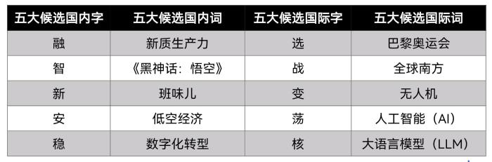 國內字詞前五位分別是“融、智、新、安、穩(wěn)”和“新質生產力、《黑神話:悟空》、班味兒、低空經濟、數字化轉型”;國際字詞前五位分別是“選、戰(zhàn)、變、蕩、核”和“巴黎奧運會、全球南方、無人機、人工智能(AI)、大語言模型(LLM)”。