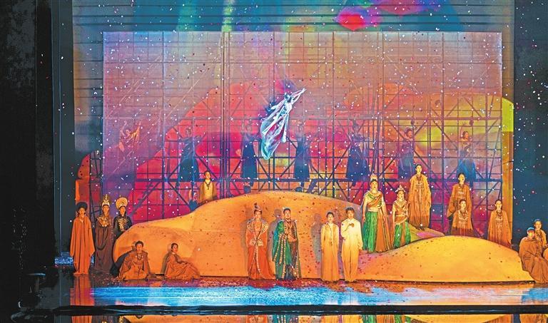 大型原創(chuàng)音樂劇《飛天》以“大愛”立意敘事,打破時(shí)空界限,利用現(xiàn)代舞美技術(shù),多維度、多角度、多層次地展現(xiàn)了敦煌石窟的無窮魅力,令觀眾身臨其境、沉浸其中,情感共鳴油然而生,獲得獨(dú)特的藝術(shù)體驗(yàn)。(本文配圖均為《飛天》劇照,由蘭州大劇院提供)