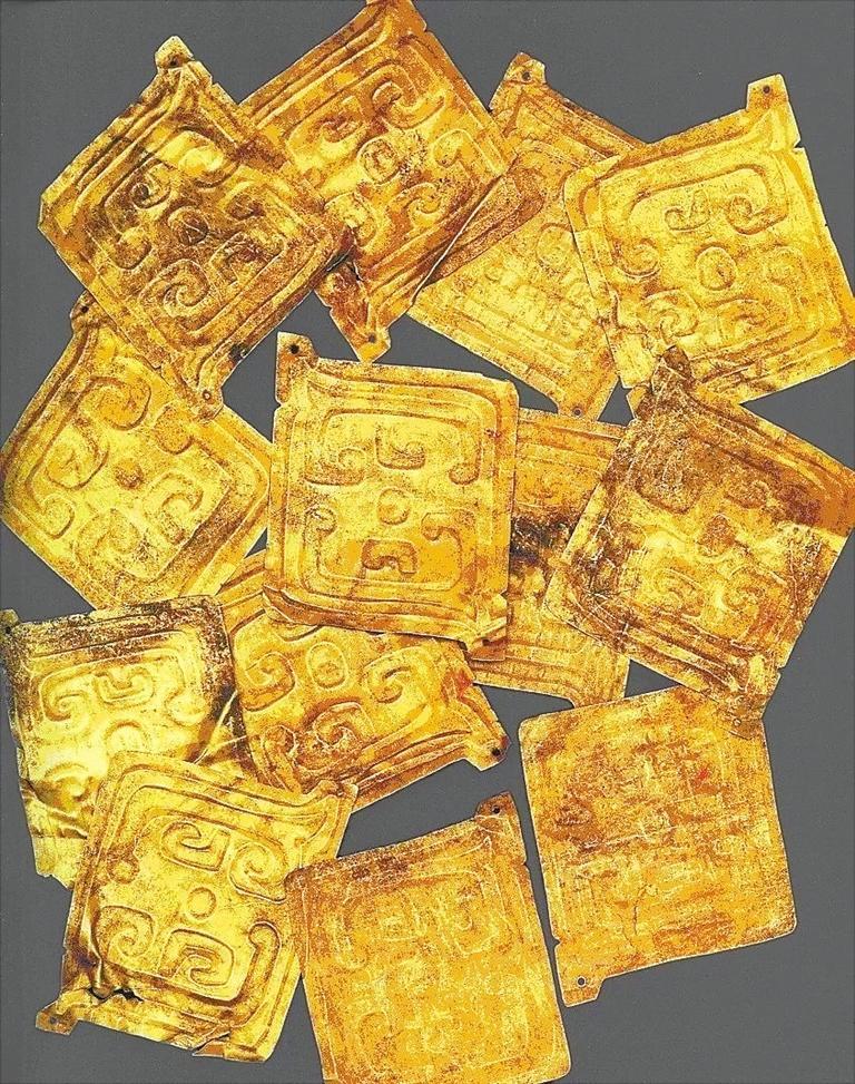 1994年春,陜西省考古研究所所長韓偉在法國、比利時訪問期間,見到了一批從香港過來的金飾片和一對金虎。韓偉先生對這組金飾片從器形、紋飾進(jìn)行了分析,并參考蘇黎世研究員莫爾夫人從金虎內(nèi)提取的木制標(biāo)本碳-14檢測結(jié)果,認(rèn)為這批金飾片為西周晚期秦人首領(lǐng)秦仲或秦莊公墓棺上的裝飾物。
