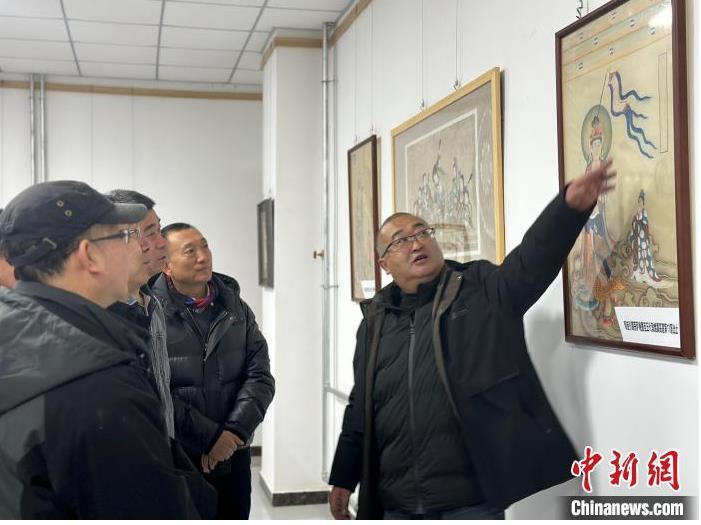 12月17日,由蘭州市七里河區(qū)委宣傳部、七里河區(qū)文體旅局聯合舉辦的“大漠孤陽映彩霞 敦煌神韻美如畫”新時代文明實踐主題活動暨敦煌巖彩畫書畫藝術展拉開帷幕。圖為展覽組織者為參觀者講解展出的作品。楊娜 攝
