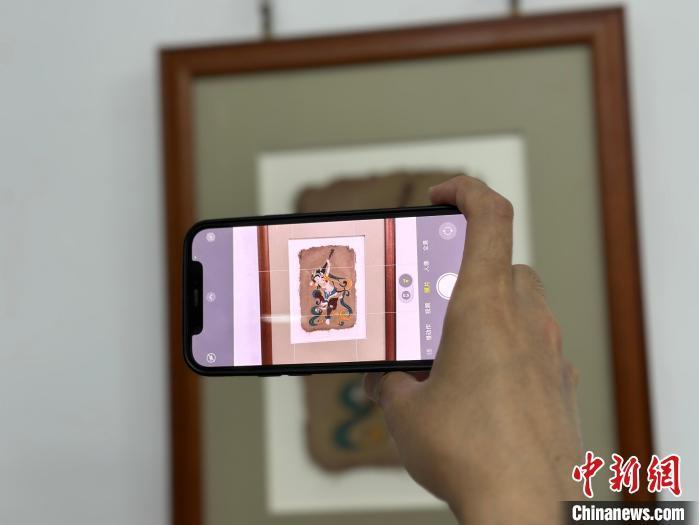 12月17日,由蘭州市七里河區(qū)委宣傳部、七里河區(qū)文體旅局聯合舉辦的“大漠孤陽映彩霞 敦煌神韻美如畫”新時代文明實踐主題活動暨敦煌巖彩畫書畫藝術展拉開帷幕。圖為參觀者拍攝展出的“反彈琵琶”題材巖彩畫。楊娜 攝