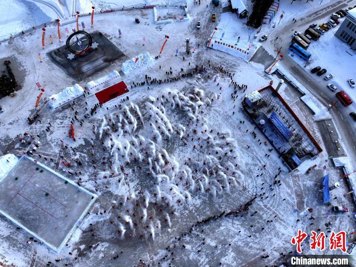 當日,北極村七星廣場上,身披紅斗篷、頭戴紅帽子的游客和當?shù)鼐用窠M成一個巨大的“53°”造型。伴隨著激情澎湃的音樂,他們擺好姿勢,將手中熱水奮力一灑,齊聲高喊“極致興安嶺 潑出好風景”,一道道劃破天際的弧線,碰撞出的神奇光影。震撼的場面讓現(xiàn)場游客驚呼不已,他們紛紛舉起手機定格這個精彩瞬間。