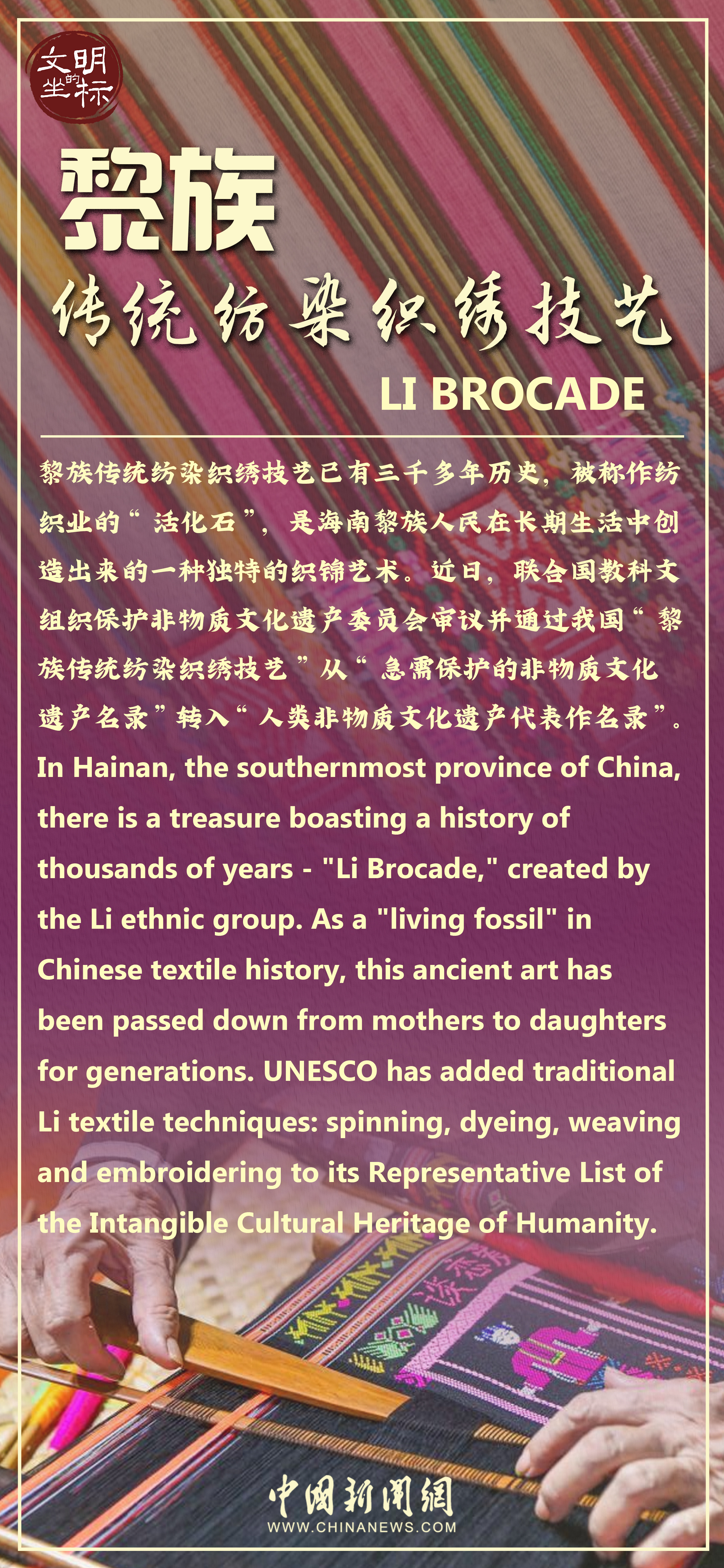 日前,黎族傳統(tǒng)紡染織繡技藝從聯(lián)合國教科文組織“急需保護的非物質(zhì)文化遺產(chǎn)名錄”轉(zhuǎn)入“人類非物質(zhì)文化遺產(chǎn)代表作名錄”,引發(fā)關(guān)注。黎族傳統(tǒng)紡染織繡技藝已有三千多年歷史,被稱作紡織業(yè)的“活化石”。對于沒有創(chuàng)造文字的黎族,黎錦像是一本“史書”,寫就了這個民族的文化和智慧。早在新石器時代,海南島上的黎族先民已會使用工具制作繩索或絲線。西漢時期,已織造出精美的“廣幅布”。至宋代,黎族的紡織達到很高水平。元代,黎族紡織工藝已傳至全國。黎族傳統(tǒng)紡染織繡技藝有麻織、棉織、織錦、印染(包括扎染)、刺繡、龍被等品種,以色彩鮮艷、圖案多樣、工藝精湛而聞名。如今,古老黎錦正穿越歷史長河,以時尚化、潮流化、年輕化的設(shè)計形態(tài)融入現(xiàn)代日常生活。