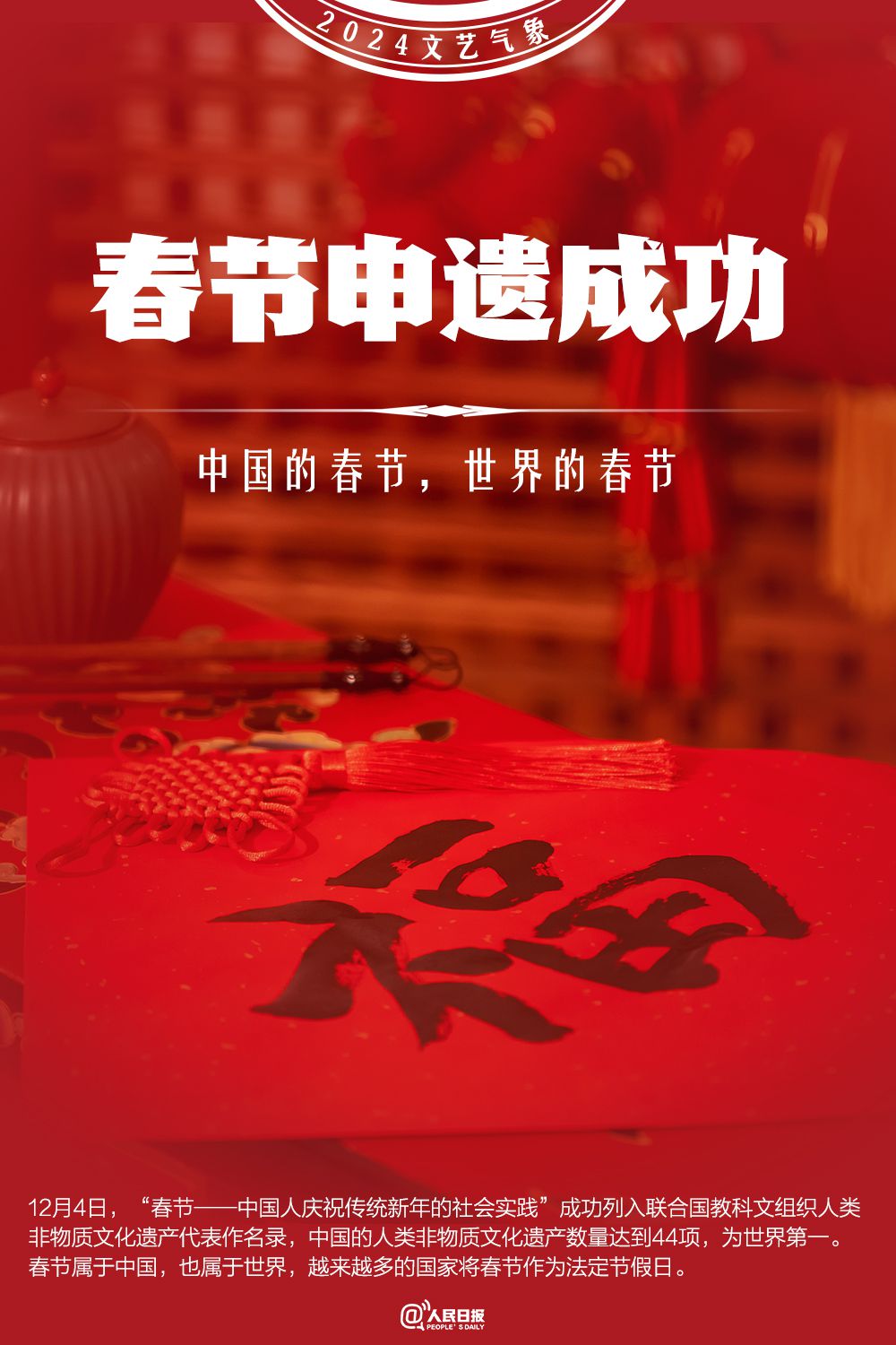 2024年7月27日,“北京中軸線——中國理想都城秩序的杰作”成功列入《世界遺產(chǎn)名錄》,中國世界遺產(chǎn)總數(shù)達(dá)到59項。12月4日,“春節(jié)——中國人慶祝傳統(tǒng)新年的社會實踐”成功列入聯(lián)合國教科文組織人類非物質(zhì)文化遺產(chǎn)代表作名錄,至此,中國共有44個項目列入聯(lián)合國教科文組織非物質(zhì)文化遺產(chǎn)名錄、名冊,總數(shù)居世界第一。