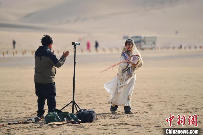 1月13日,甘肅敦煌鳴沙山月牙泉景區(qū)內(nèi),游人進行旅拍。中新社記者 李亞龍 攝