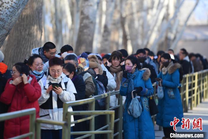 1月13日,甘肅敦煌莫高窟景區(qū)內(nèi),游人在工作人員引導下排隊參觀。中新社記者 李亞龍 攝