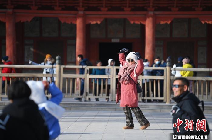 1月13日,甘肅敦煌莫高窟景區(qū)內(nèi),游人在莫高窟標志性建筑九層樓前拍照打卡。中新社記者 李亞龍 攝