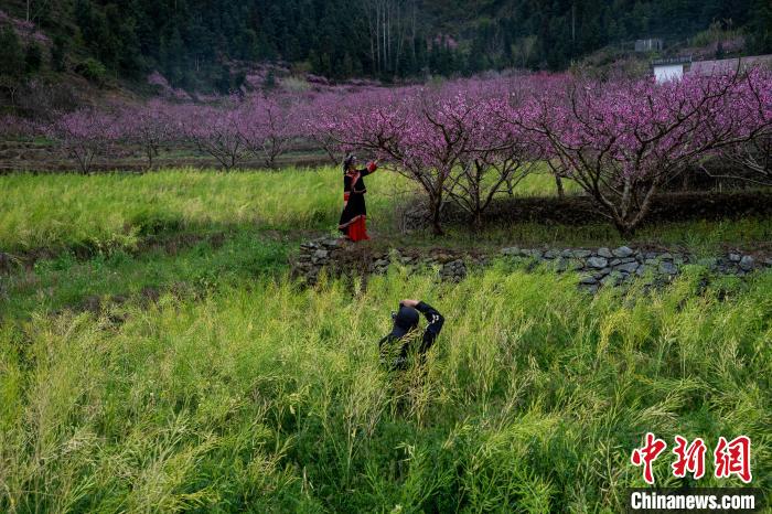 3月15日,在廣西田林縣浪平鎮(zhèn)浪平村,盛開的桃花引來游客前來“打卡”拍照。黃數(shù)情 攝