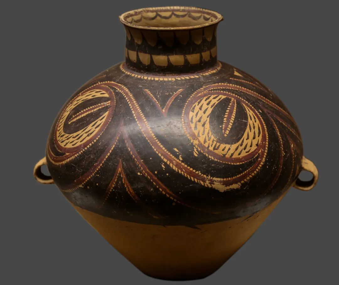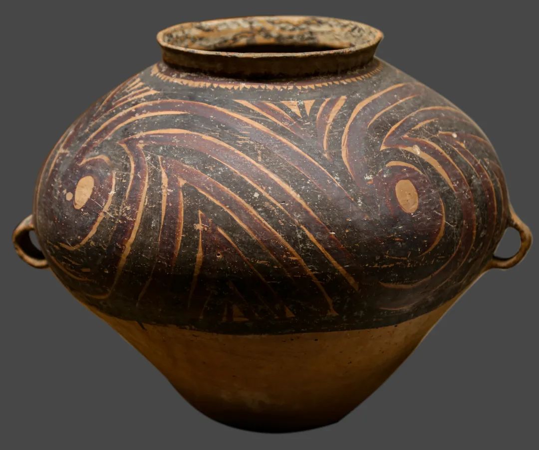 紋飾:以黑彩為主,常見漩渦紋、水波紋、平行線紋、網(wǎng)格紋、同心圓紋等,部分陶器上出現(xiàn)早期人像紋或舞蹈紋。