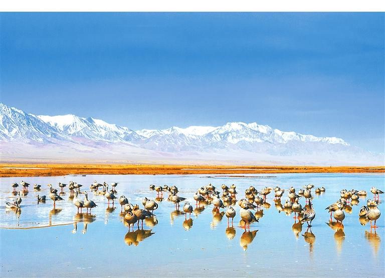 當(dāng)祁連山的雪線以肉眼難以察覺的速度后退時(shí),鹽池灣的冰封鏡面開始出現(xiàn)裂紋。最先感知到這一變化的不是融水沖刷出的溝壑,而是斑頭雁黃色的喙。它們?cè)谌碌椎某炕杈€上劃過,雙翅呼呼生風(fēng)。冰凌碎屑尚未與雁羽摩擦,便已發(fā)出細(xì)密的簌響,像是古琴開弦前的調(diào)音。野馬南山與黨河南山兩山之間形成的盆地內(nèi)河流縱橫、湖泊密布,草甸、沼澤交錯(cuò),是斑頭雁和其他水鳥世代棲息繁衍的場所。盡管先頭部隊(duì)在3月下旬就已抵達(dá)這里,主力部隊(duì)卻要到4月上旬才會(huì)姍姍來遲。此時(shí)斑頭雁幼體已在越冬地充分發(fā)育,羽衣上幾乎看不到如苔蘚般斑駁生長的新羽,只是頭部的兩條黑帶不如父母深邃,這是它們少經(jīng)風(fēng)霜的證明。它們降落在濕地灘涂時(shí),雝雝鳴雁,那聲音或許與兩千年前蘇武牧羊時(shí)在北海之畔聽到的有些許相似。