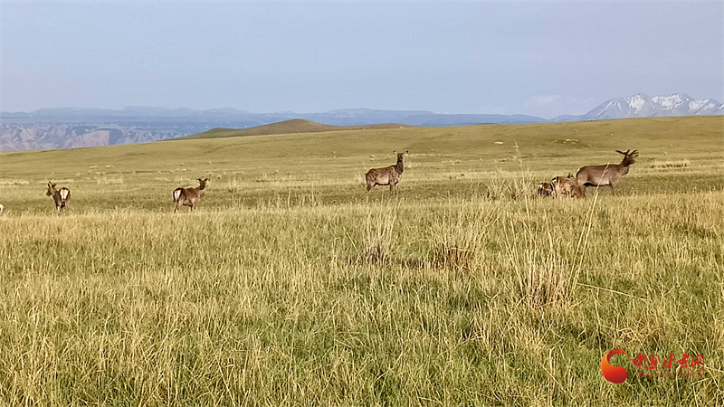 初夏的肅南大河草原牧草逐漸返青,一群群馬鹿在草原上悠閑覓食,游客到來并沒有打擾它們的正常活動。