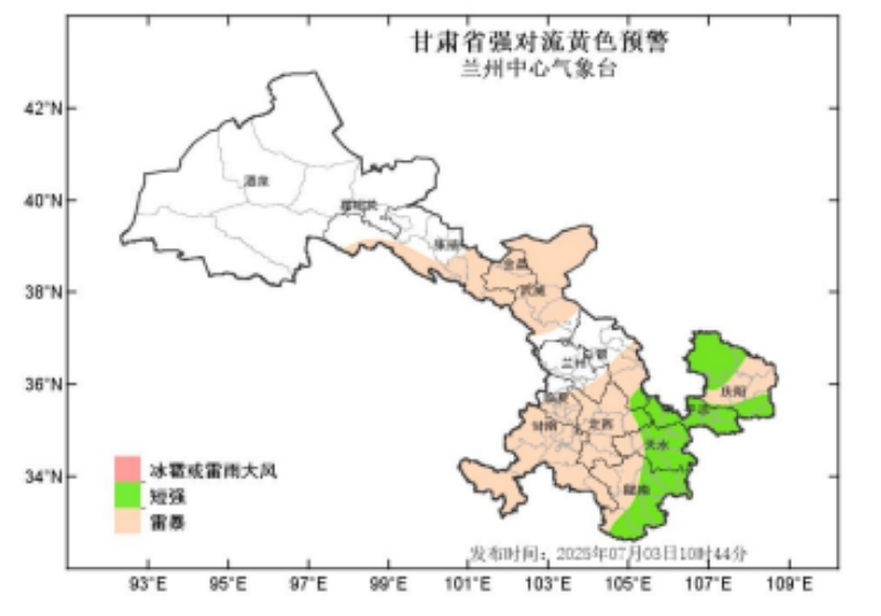 蘭州中心氣象臺(tái)2025年7月3日10時(shí)44分繼續(xù)發(fā)布強(qiáng)對(duì)流黃色預(yù)警:預(yù)計(jì)未來(lái)24小時(shí),張掖、金昌、武威、蘭州、白銀、甘南、臨夏、定西、隴南、天水、平?jīng)觥c陽(yáng)等州市有雷暴,其中隴南、天水、平?jīng)?、慶陽(yáng)等市部分地方及白銀、定西兩市局部地方有短時(shí)強(qiáng)降水,最大小時(shí)雨強(qiáng)20-60mm;隴南、天水、平?jīng)?、慶陽(yáng)等市強(qiáng)降水在未來(lái)24小時(shí)內(nèi)多發(fā),白銀、定西主要強(qiáng)降水時(shí)段在4日2-8時(shí)。請(qǐng)注意防范!