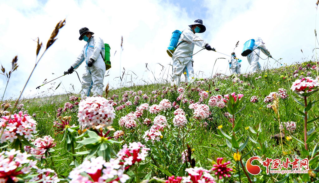 盛夏時節(jié),位于張掖市肅南裕固族自治縣的皇城夏日塔拉草原、康樂賽汗塔拉草原,宛如一塊巨大的綠色絨毯鋪向天際,滿目翠綠,令人心醉神迷。然而,此時也正是草原上狼毒花毒害草盛放、蝗蟲繁殖的高峰期。連日來,肅南縣林草專業(yè)技術人員帶領2000多牧民,抓住毒害草開花、蝗蟲繁殖最快,也是清除滅殺的最佳時機,在“三北”工程六期160多萬畝廣袤的草原上,打響了以“蟲害防治+害草治理+噴施葉面+播撒草籽的”為核心的“三北”工程林草濕荒一體化保護修復攻堅戰(zhàn)。
