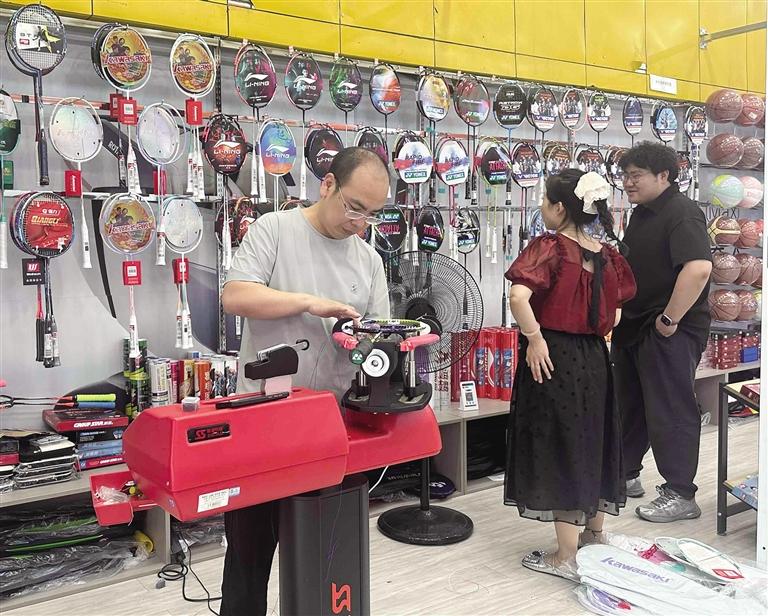 不僅如此,運(yùn)動(dòng)用品銷售也迎來小高峰。瑞德摩爾太平洋商場內(nèi)的健雄體育用品店內(nèi),老板正忙著給羽毛球空拍穿線。“我們不僅有現(xiàn)成的羽毛球拍,還可以根據(jù)客戶的需求給空拍穿線。”該店老板介紹,羽毛球拍網(wǎng)線價(jià)位30至100元不等,購線還可免手工費(fèi)。羽毛球初學(xué)者一般都會買成品拍自己在家練習(xí),而一些技術(shù)較好的顧客除了會選擇品質(zhì)較好的空拍,還會現(xiàn)場選線拉網(wǎng)定制屬于自己的球拍。“暑假以來,店內(nèi)羽毛球拍銷量大增,穿線需求也逐漸增多,周末從早忙到晚,每半小時(shí)穿一個(gè)球拍,最多一天穿24個(gè),排隊(duì)等候已成常態(tài)。”此外,不少運(yùn)動(dòng)品牌也順勢推出促銷活動(dòng),吸引消費(fèi)者選購。