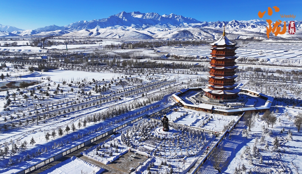 雪后初霽,銀白的民樂公園,在陽光下熠熠生輝,安靜且神秘,與遠處綿延的祁連山構成一幅璀璨的畫卷。