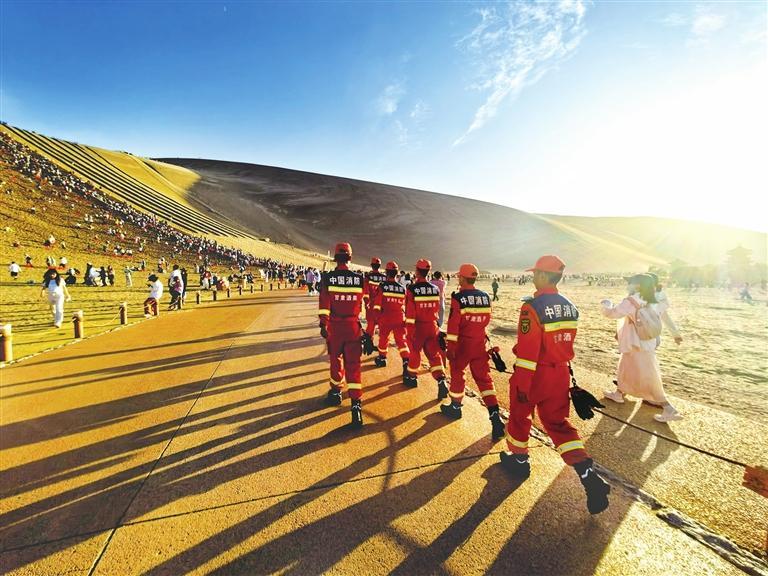 溫情關(guān)愛救助游客。鳴沙山“萬(wàn)人大合唱”作為敦煌近年來(lái)的熱門文旅項(xiàng)目,暑期每日吸引數(shù)萬(wàn)游客前來(lái)打卡,人群密集,安全隱患不容忽視。根據(jù)敦煌市委、市政府的安排,大隊(duì)每天派出消防車輛和指戰(zhàn)員現(xiàn)場(chǎng)執(zhí)勤,并根據(jù)實(shí)際需要在月牙泉和鳴沙山設(shè)置了兩處群眾服務(wù)救助執(zhí)勤點(diǎn),由20人組成“九色鹿”女子消防服務(wù)隊(duì),提供傷病緊急救助、失物尋找、人員疏散引導(dǎo)、安全知識(shí)宣傳教育等服務(wù)。僅今年,就幫助找回走失兒童21名、手機(jī)和錢包60余件,救助中暑等突發(fā)疾病游客7人。“九色鹿”女子消防服務(wù)隊(duì)的隊(duì)員們既懂外語(yǔ),又了解敦煌文化,還熟悉消防安全知識(shí),掌握一定的醫(yī)療救助和應(yīng)急救援技能,她們的貼心服務(wù)受到了游客的好評(píng),成為敦煌一道亮麗的風(fēng)景線。