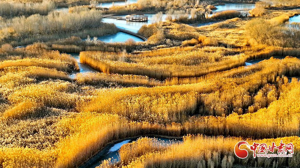 12月4日,張掖市黑河濕地國家級自然保護(hù)區(qū)內(nèi),經(jīng)風(fēng)霜浸染的蘆葦與蒲草披上金裝。從高空俯瞰,夕陽下的蘆葦蕩如金色海洋,蘆花隨風(fēng)輕舞,碧水凝冰環(huán)繞其間,宛如一幅鋪展的濕地金畫卷,吸引眾多游客與攝影愛好者前來觀賞拍攝。